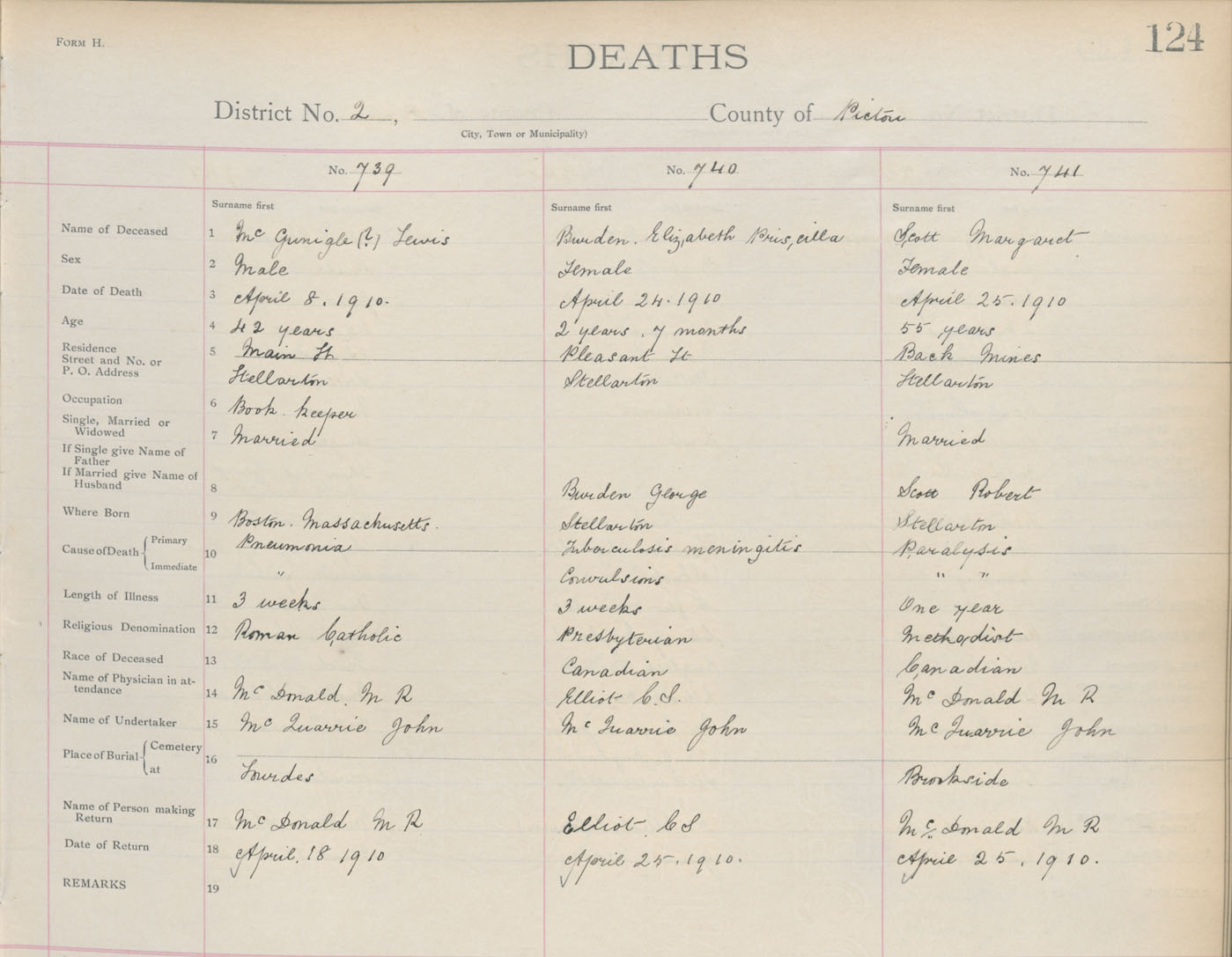 Death Registration: Year: 1910 book: 14 page: 124 number: 739