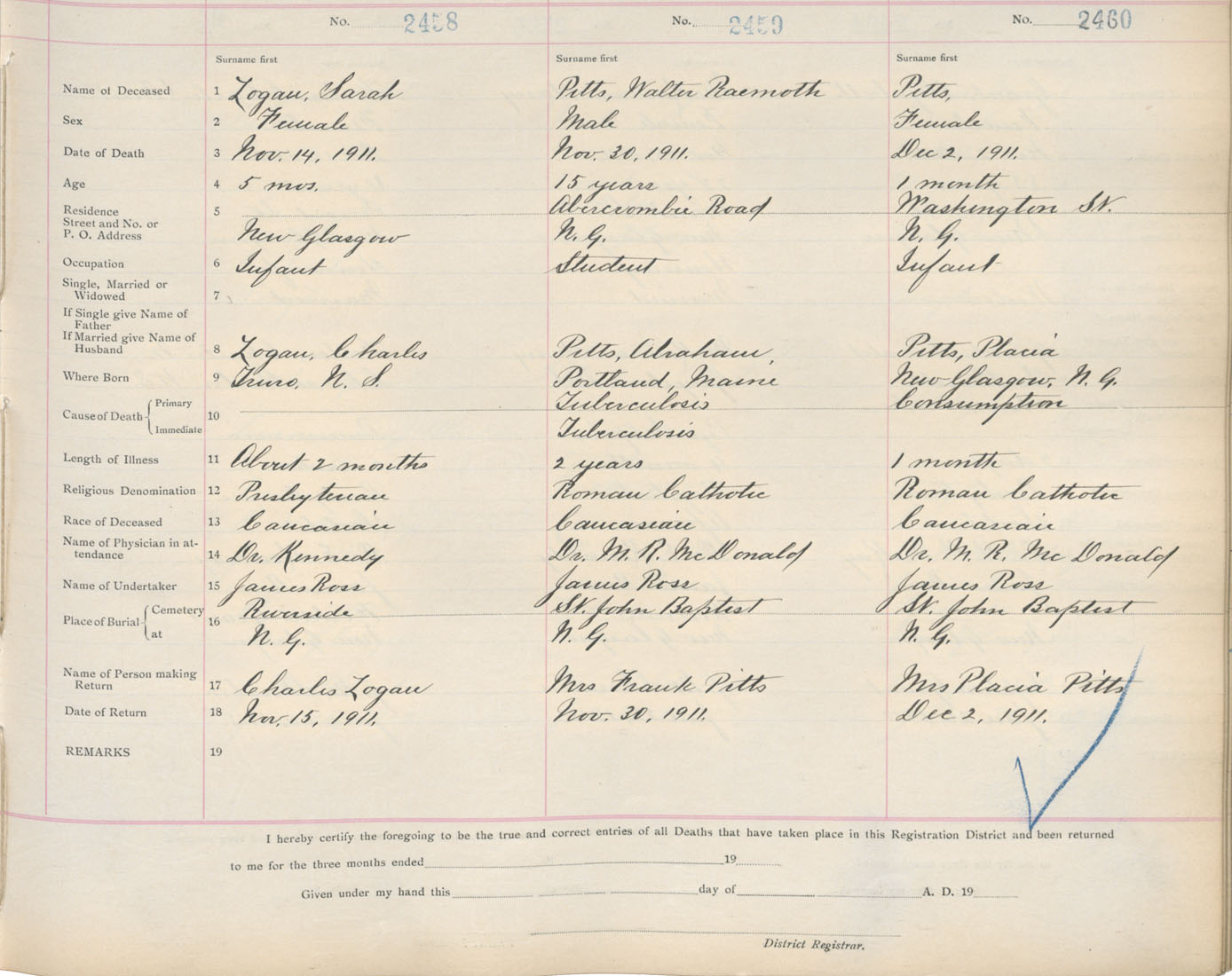 Female Death Registration: Year: 1911 book: 14 page: 410 number: 2460