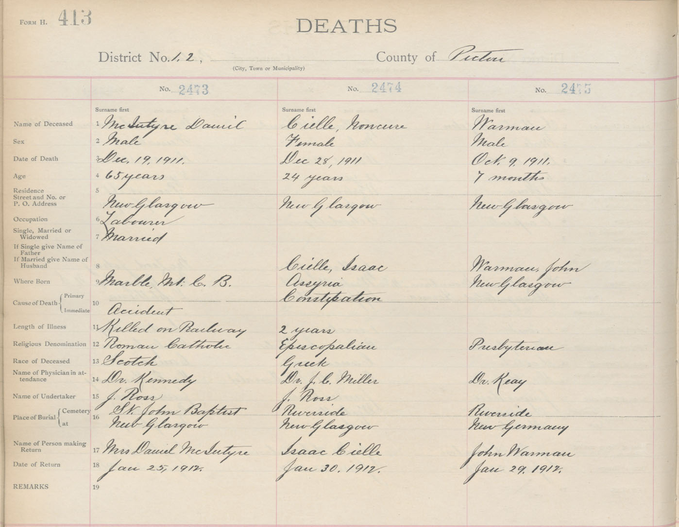 Male Death Registration: Year: 1911 book: 14 page: 413 number: 2475