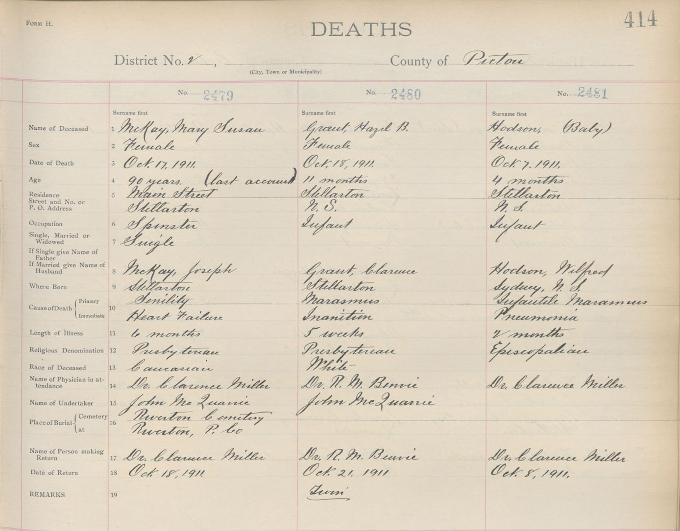 Female Death Registration: Year: 1911 book: 14 page: 414 number: 2481