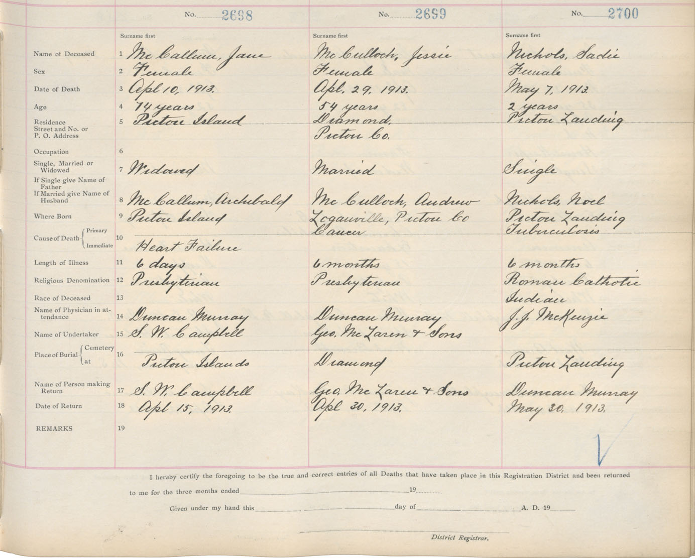 Death Registration: Year: 1913 book: 14 page: 450 number: 2698
