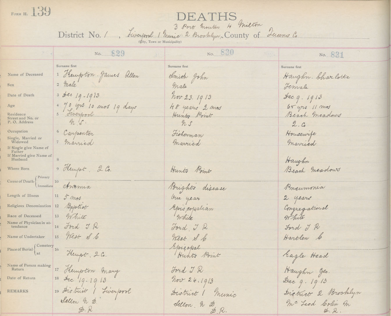 Female Death Registration: Year: 1913 book: 15 page: 139 number: 831