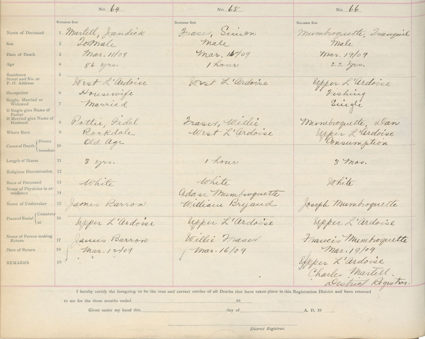 Death Registration: Year: 1909 book: 16 page: 11 number: 66