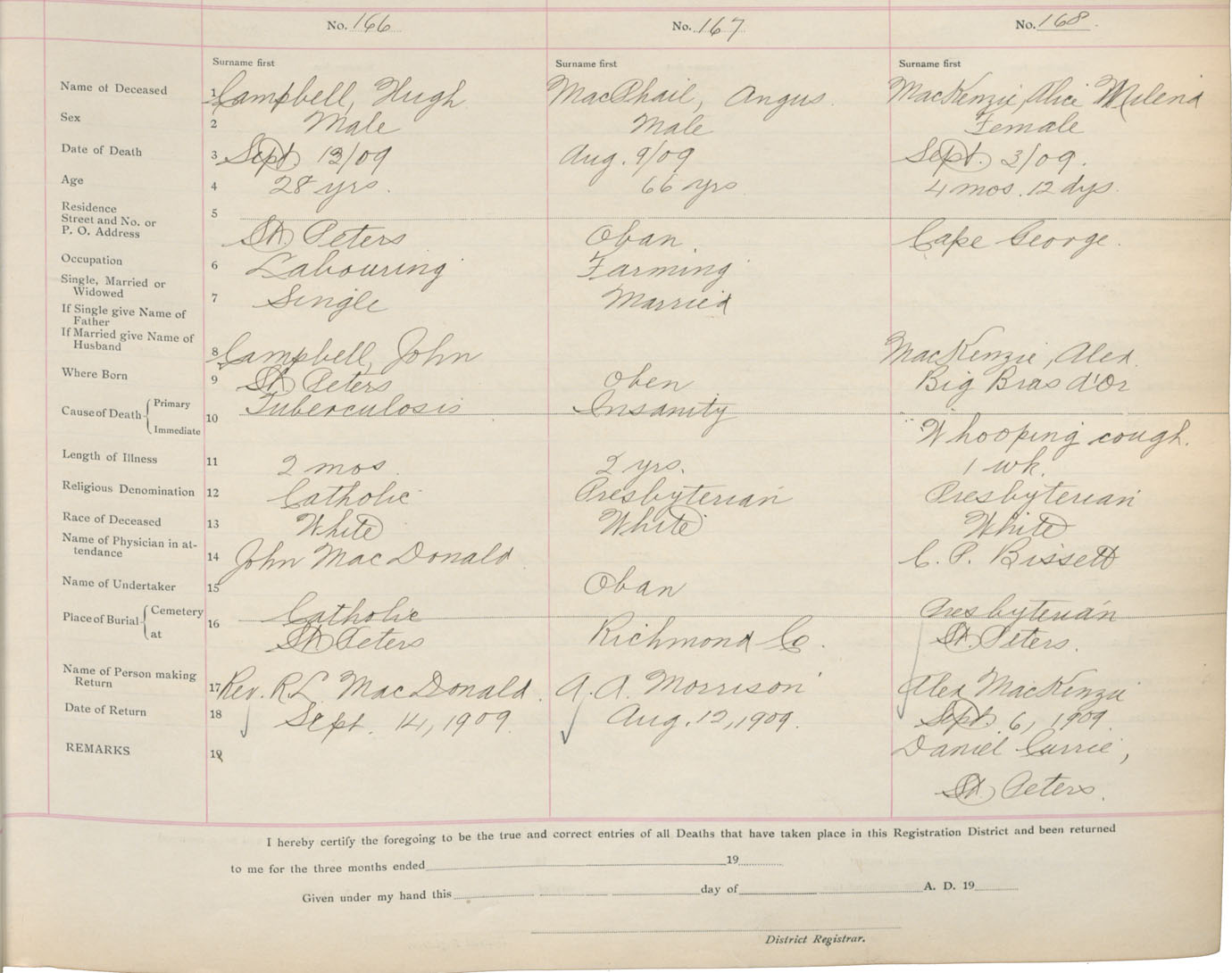 Death Registration: Year: 1909 book: 16 page: 28 number: 168