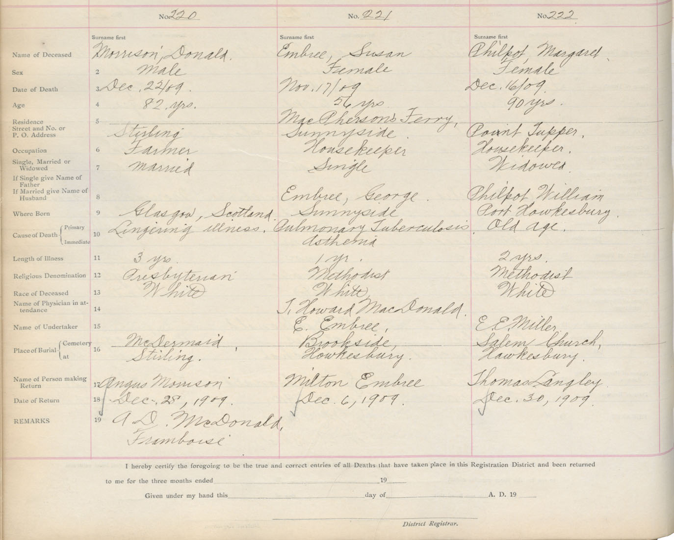 Death Registration: Year: 1909 book: 16 page: 37 number: 220