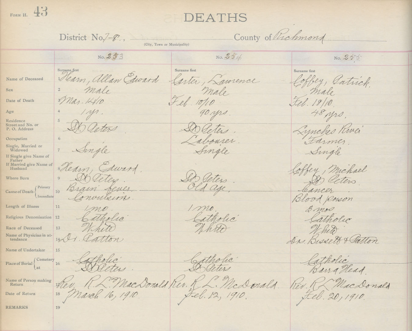 Death Registration: Year: 1910 book: 16 page: 43 number: 255