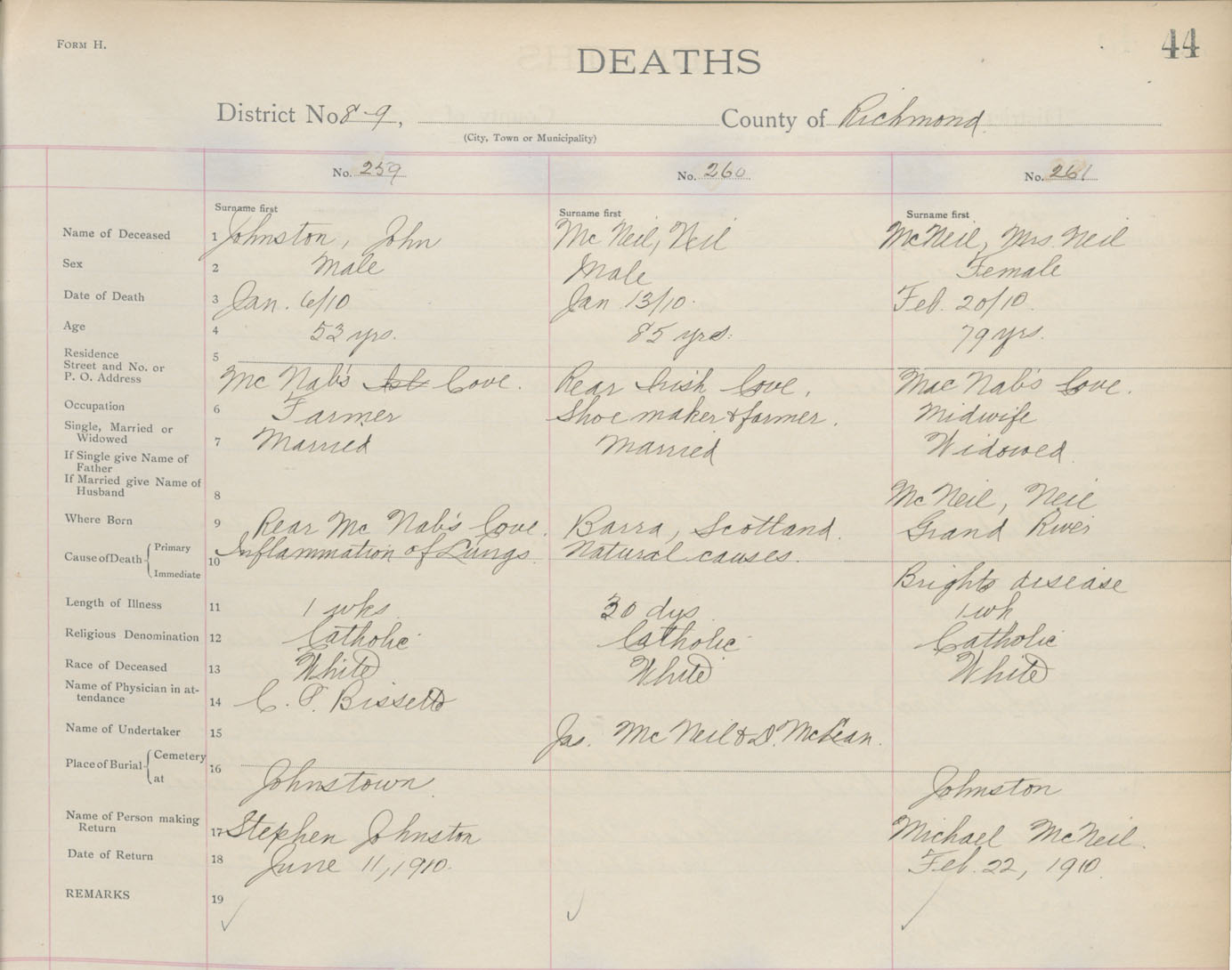 Death Registration: Year: 1910 book: 16 page: 44 number: 261
