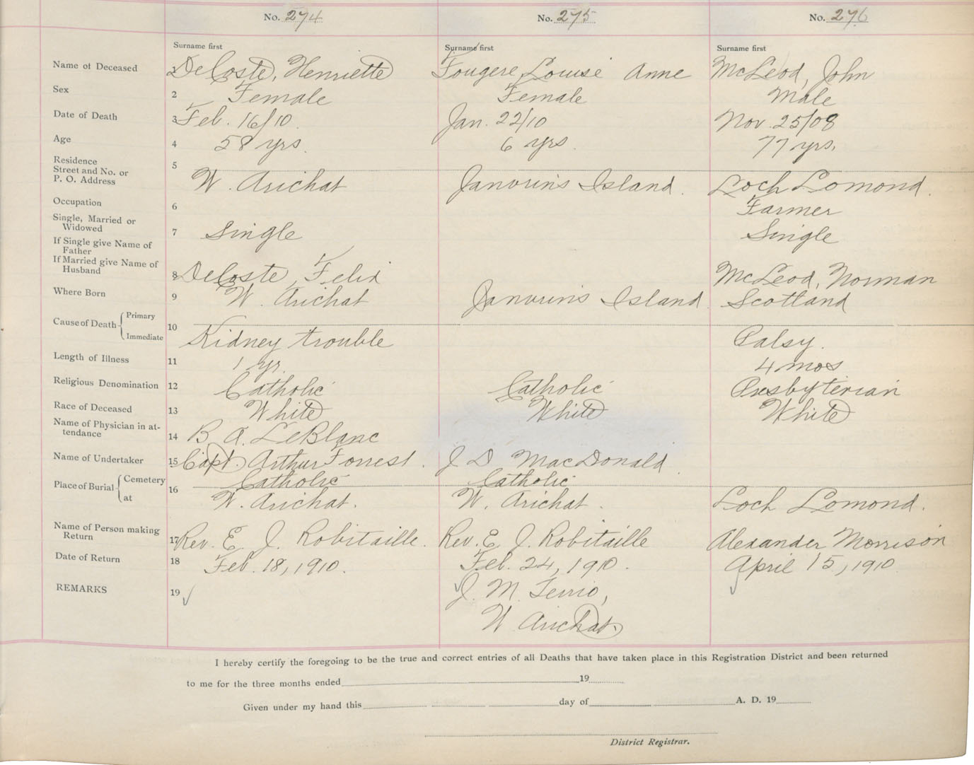 Death Registration: Year: 1910 book: 16 page: 46 number: 276