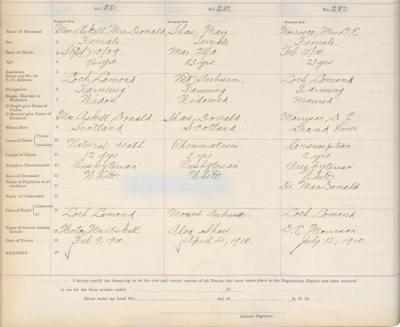 Death Registration: Year: 1910 book: 16 page: 47 number: 282