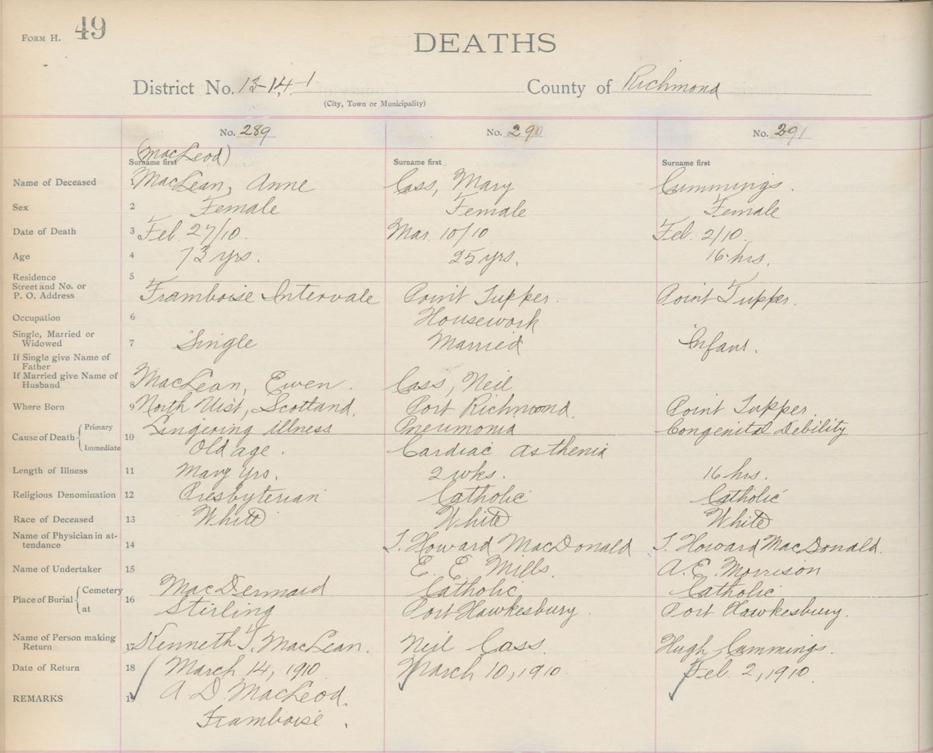 Death Registration: Year: 1910 book: 16 page: 49 number: 291
