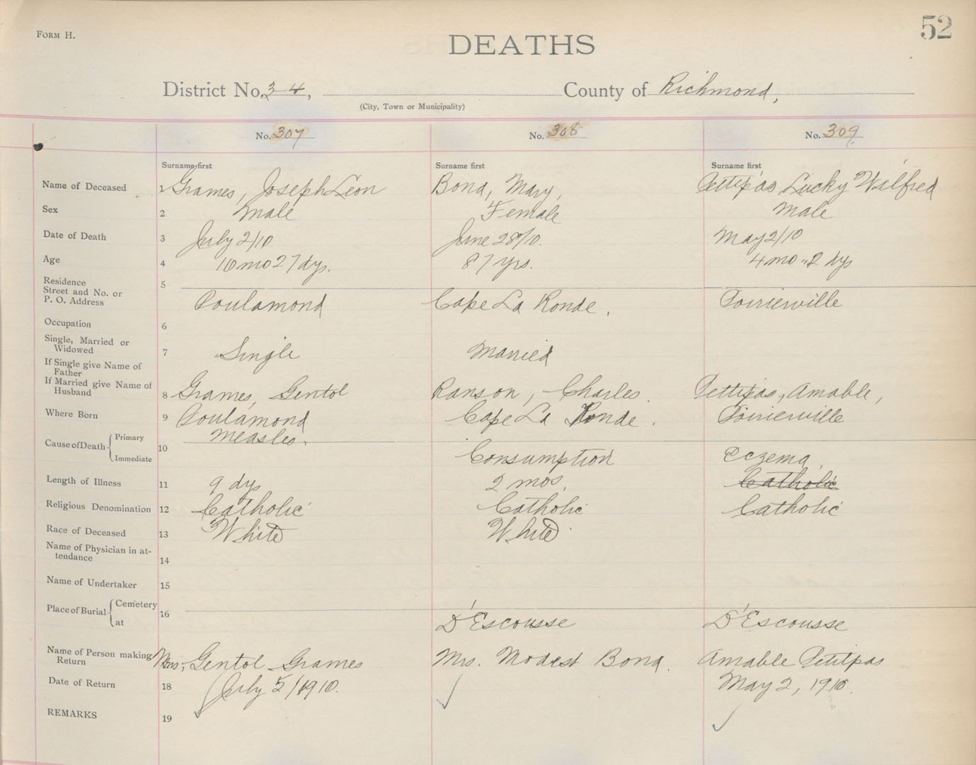 Death Registration: Year: 1910 book: 16 page: 52 number: 309