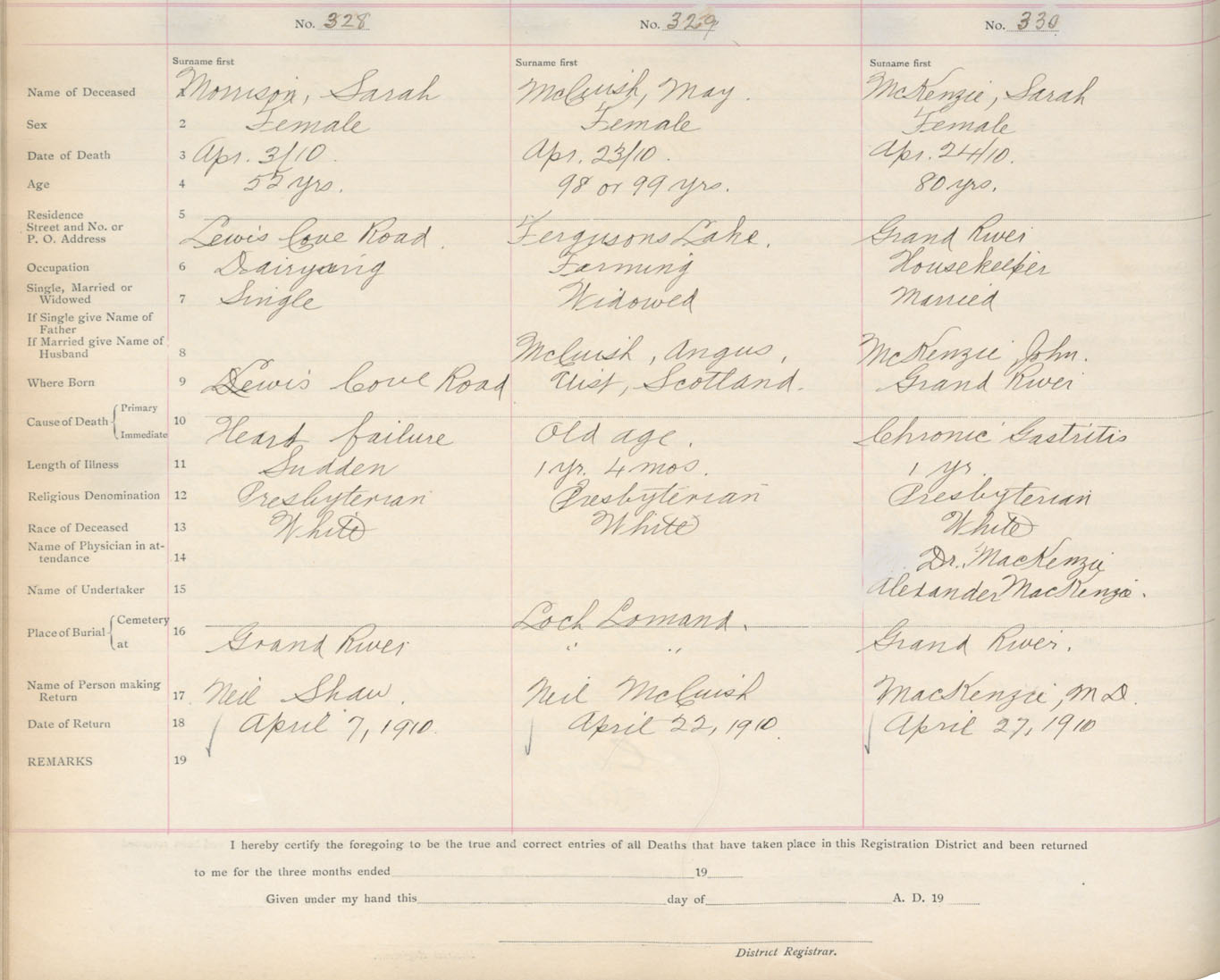 Death Registration: Year: 1910 book: 16 page: 55 number: 330