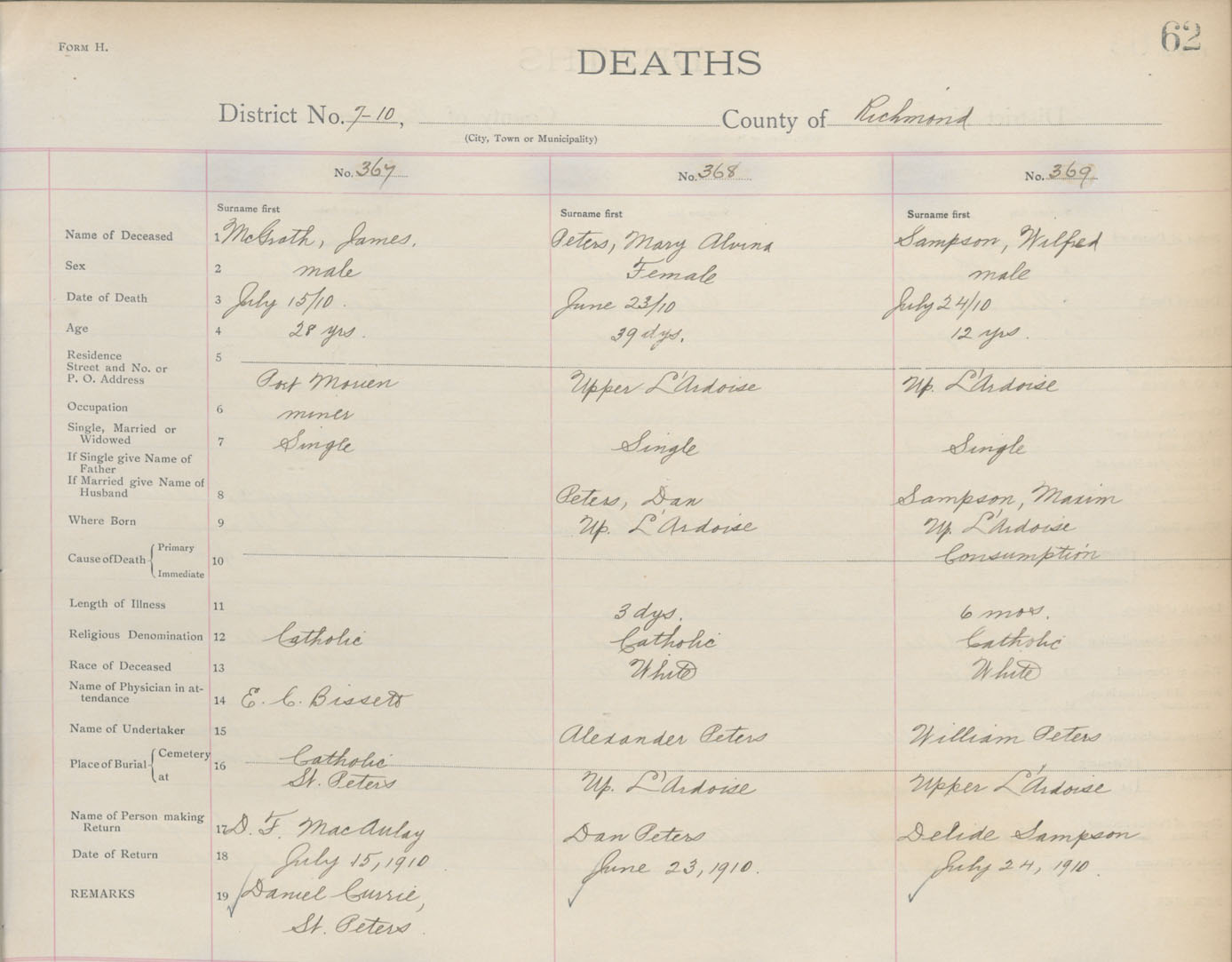Death Registration: Year: 1910 book: 16 page: 62 number: 367
