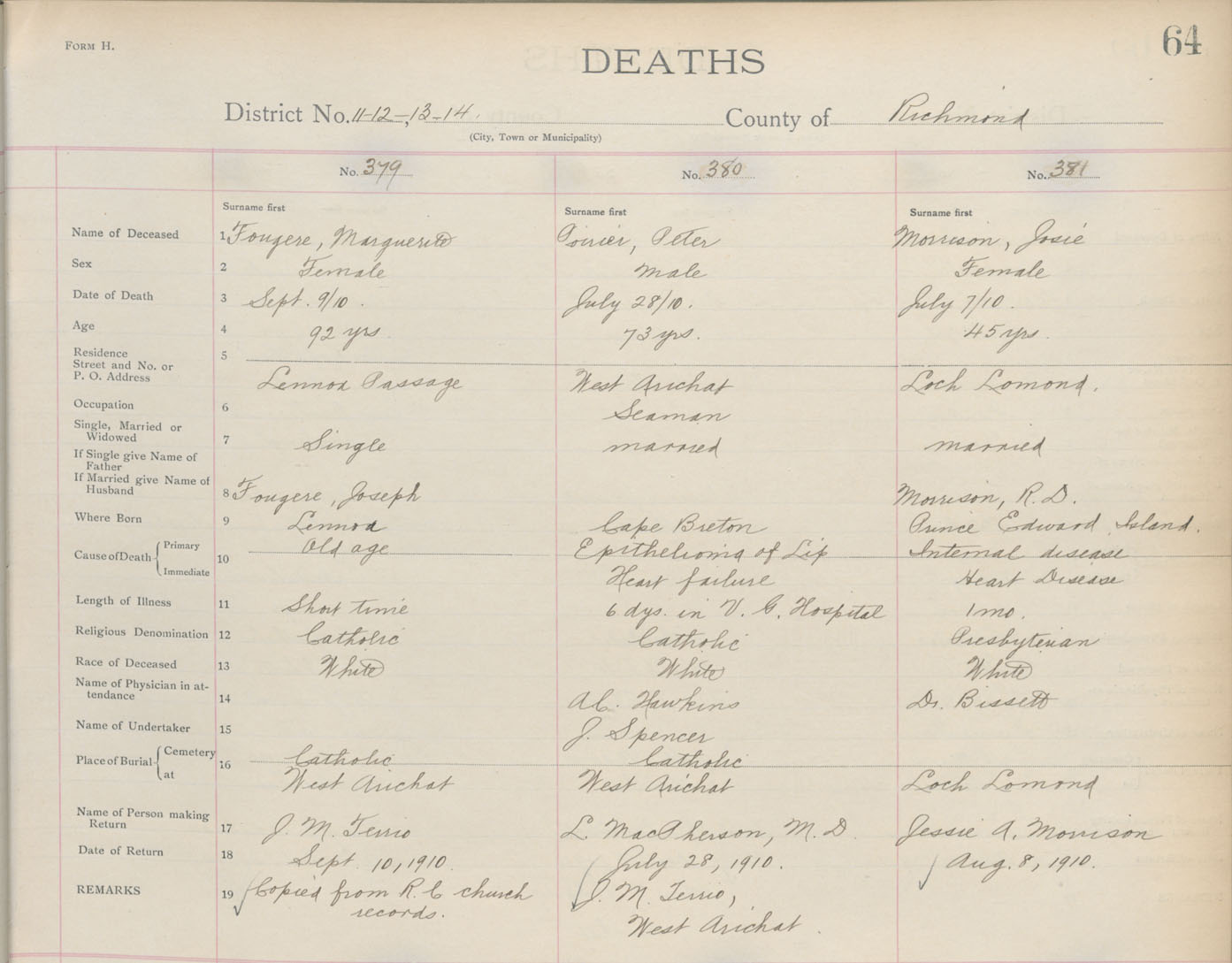 Death Registration: Year: 1910 book: 16 page: 64 number: 379