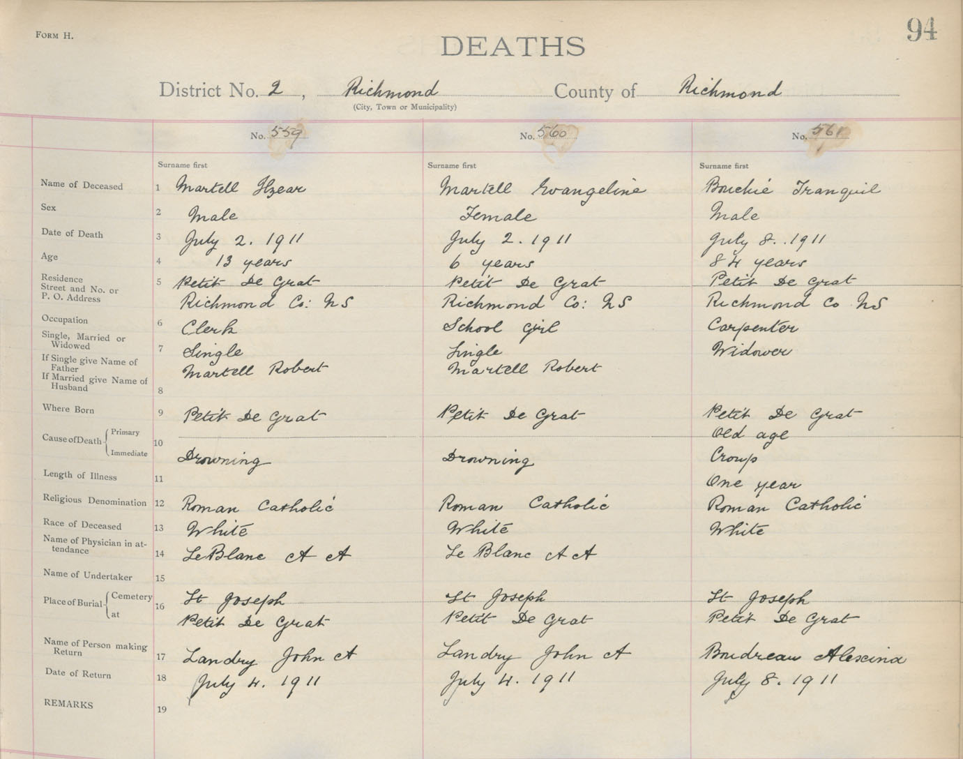 Death Registration: Year: 1911 book: 16 page: 94 number: 559