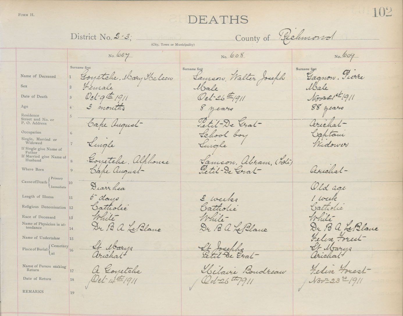 Death Registration: Year: 1911 book: 16 page: 102 number: 607