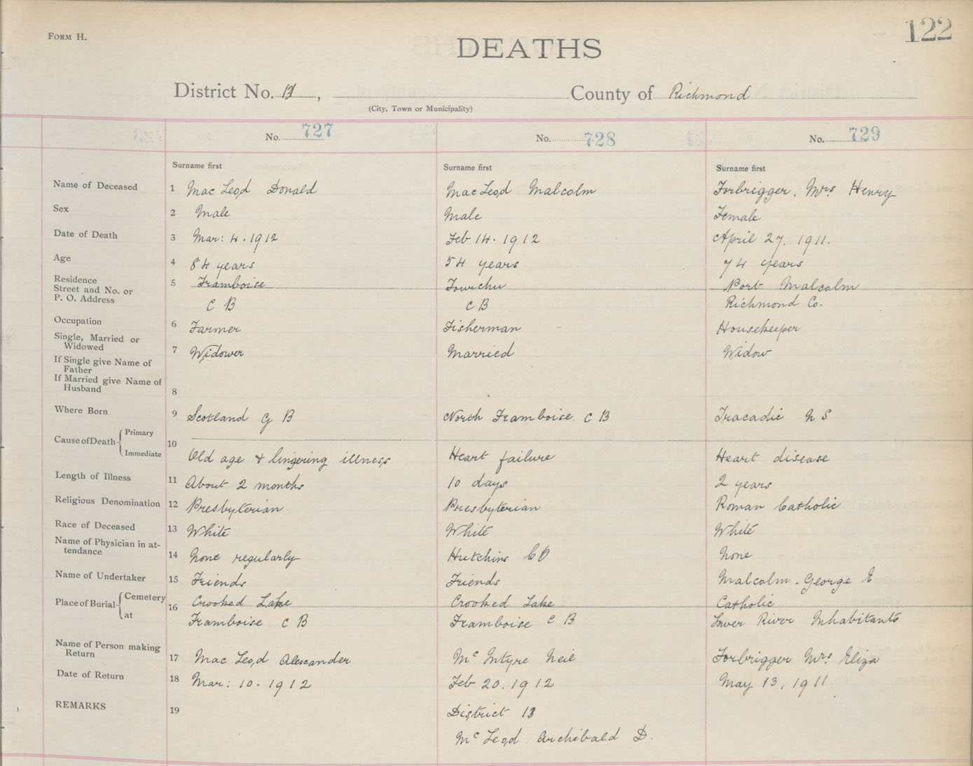 Male Death Registration: Year: 1912 book: 16 page: 122 number: 727