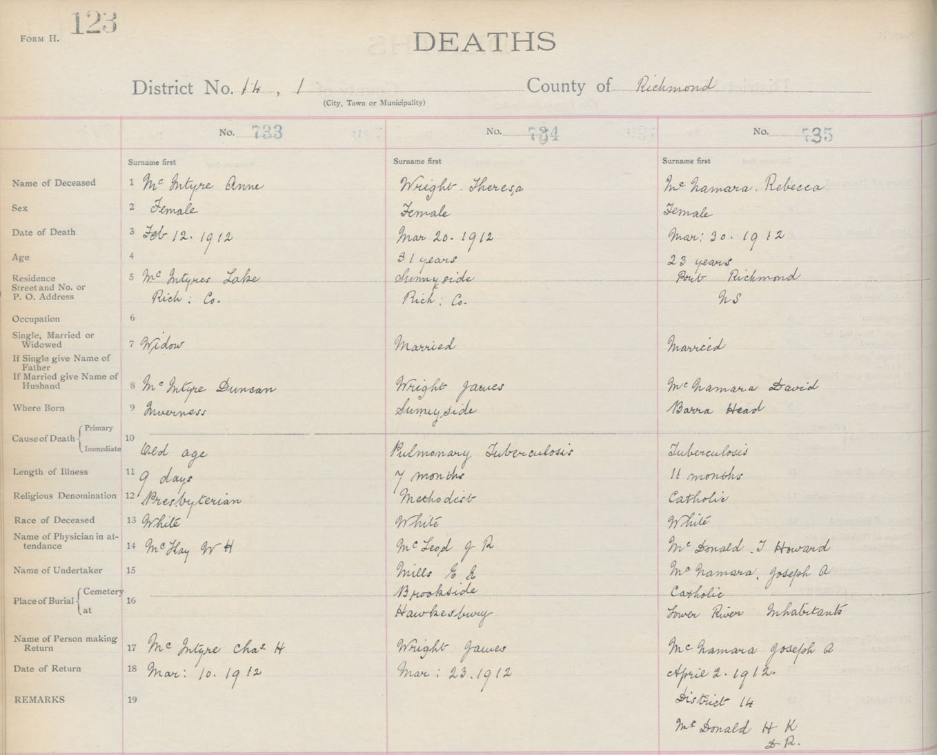 Death Registration: Year: 1912 book: 16 page: 123 number: 733