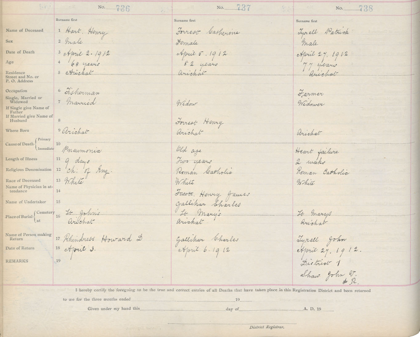 Death Registration: Year: 1912 book: 16 page: 123 number: 736