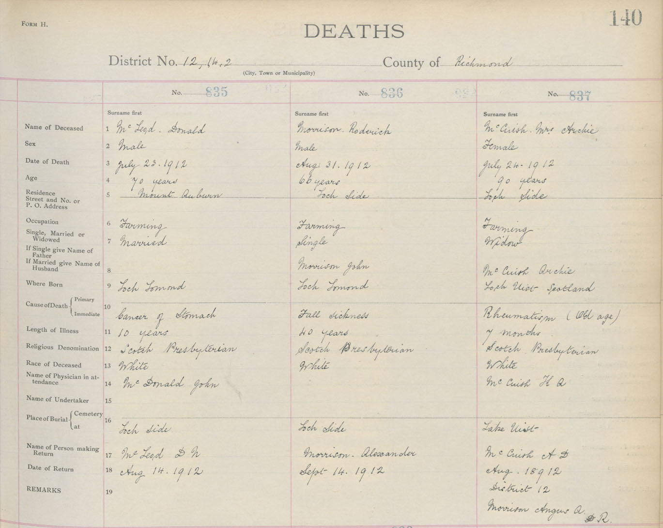 Death Registration: Year: 1912 book: 16 page: 140 number: 835