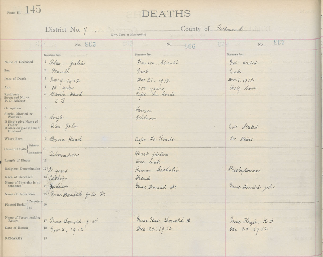 Death Registration: Year: 1912 book: 16 page: 145 number: 865