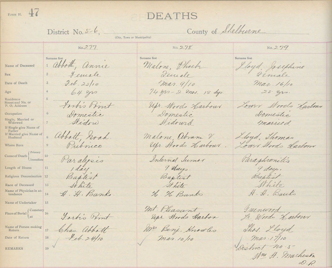Death Registration: Year: 1910 book: 17 page: 47 number: 279