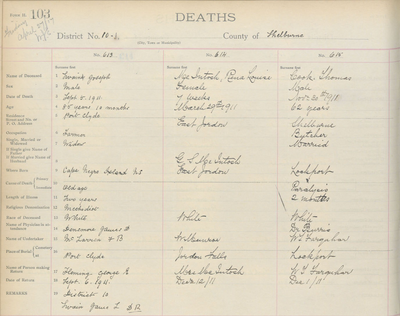 Death Registration: Year: 1911 book: 17 page: 103 number: 613