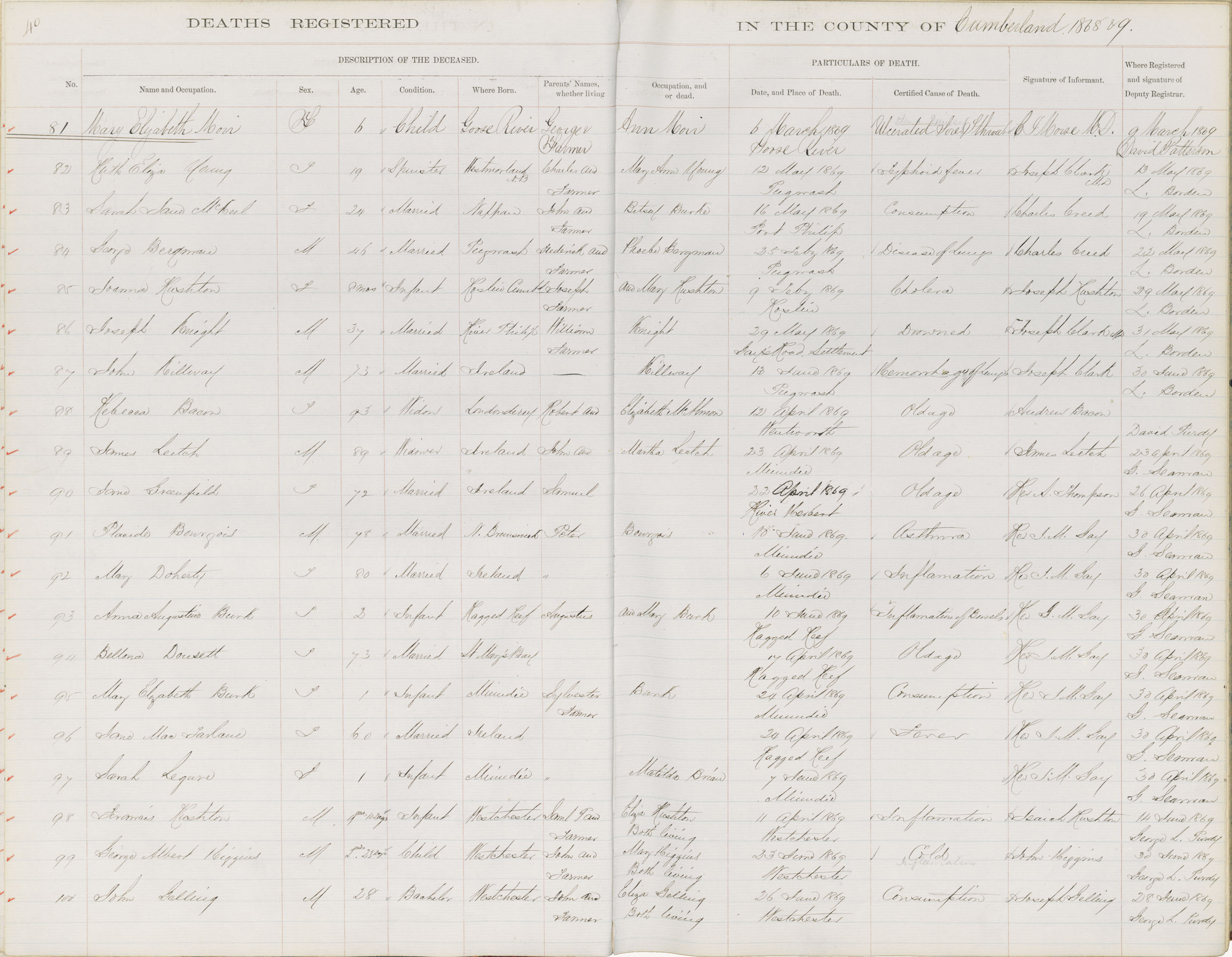 Death Registration: Year: 1869 book: 1805 page: 40 number: 81