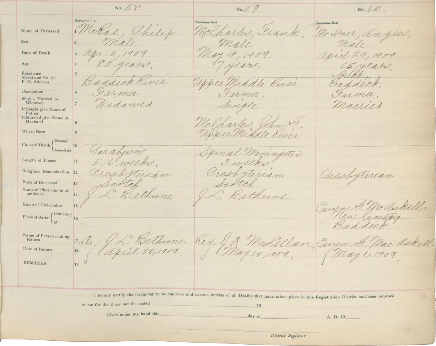 Male Death Registration: Year: 1909 book: 18 page: 10 number: 60