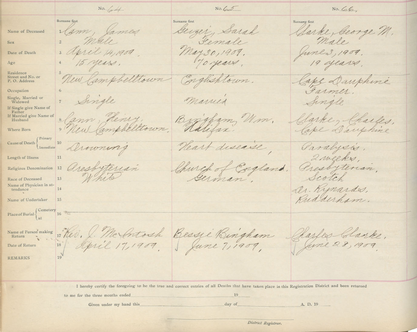 Death Registration: Year: 1909 book: 18 page: 11 number: 66