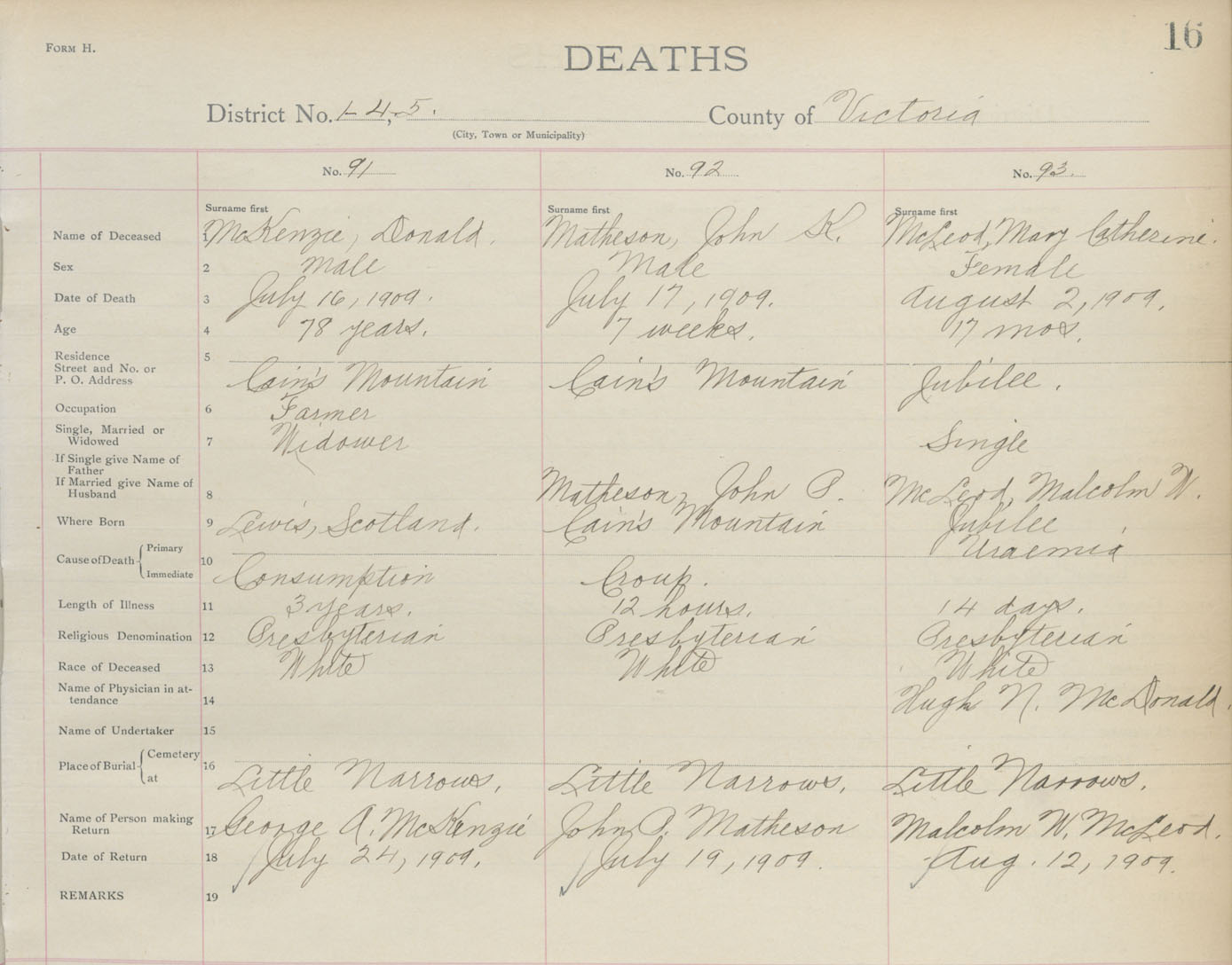 Death Registration: Year: 1909 book: 18 page: 16 number: 93