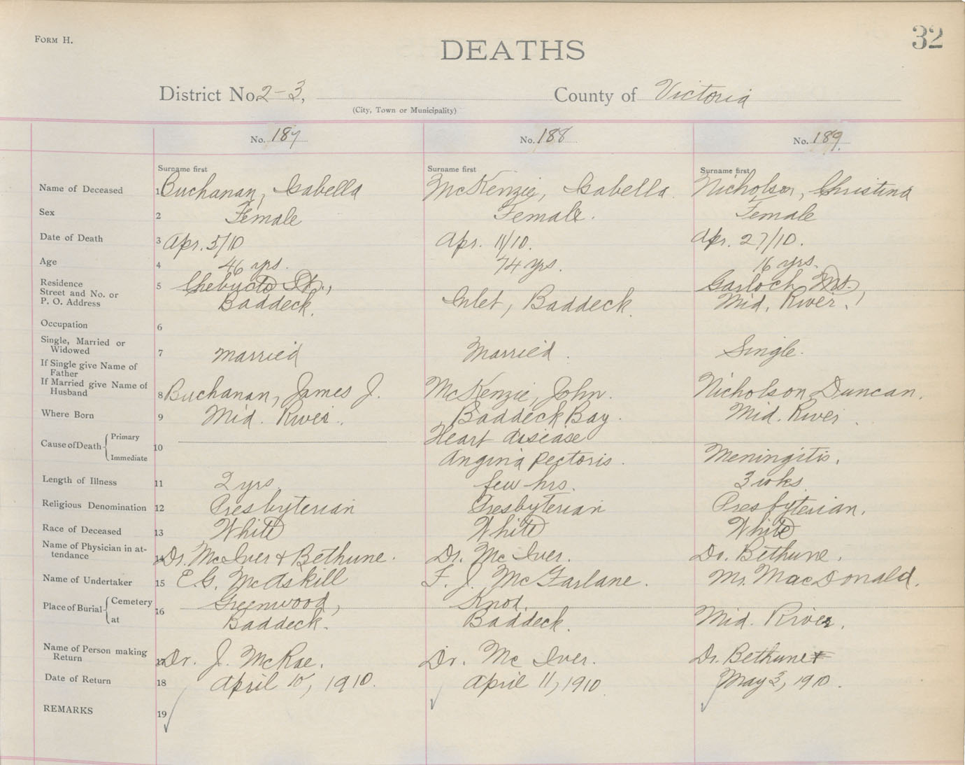 Death Registration: Year: 1910 book: 18 page: 32 number: 189
