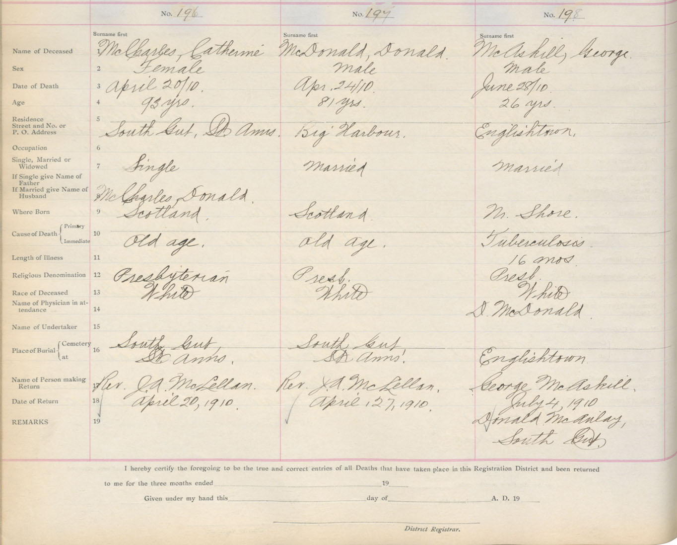 Death Registration: Year: 1910 book: 18 page: 33 number: 198