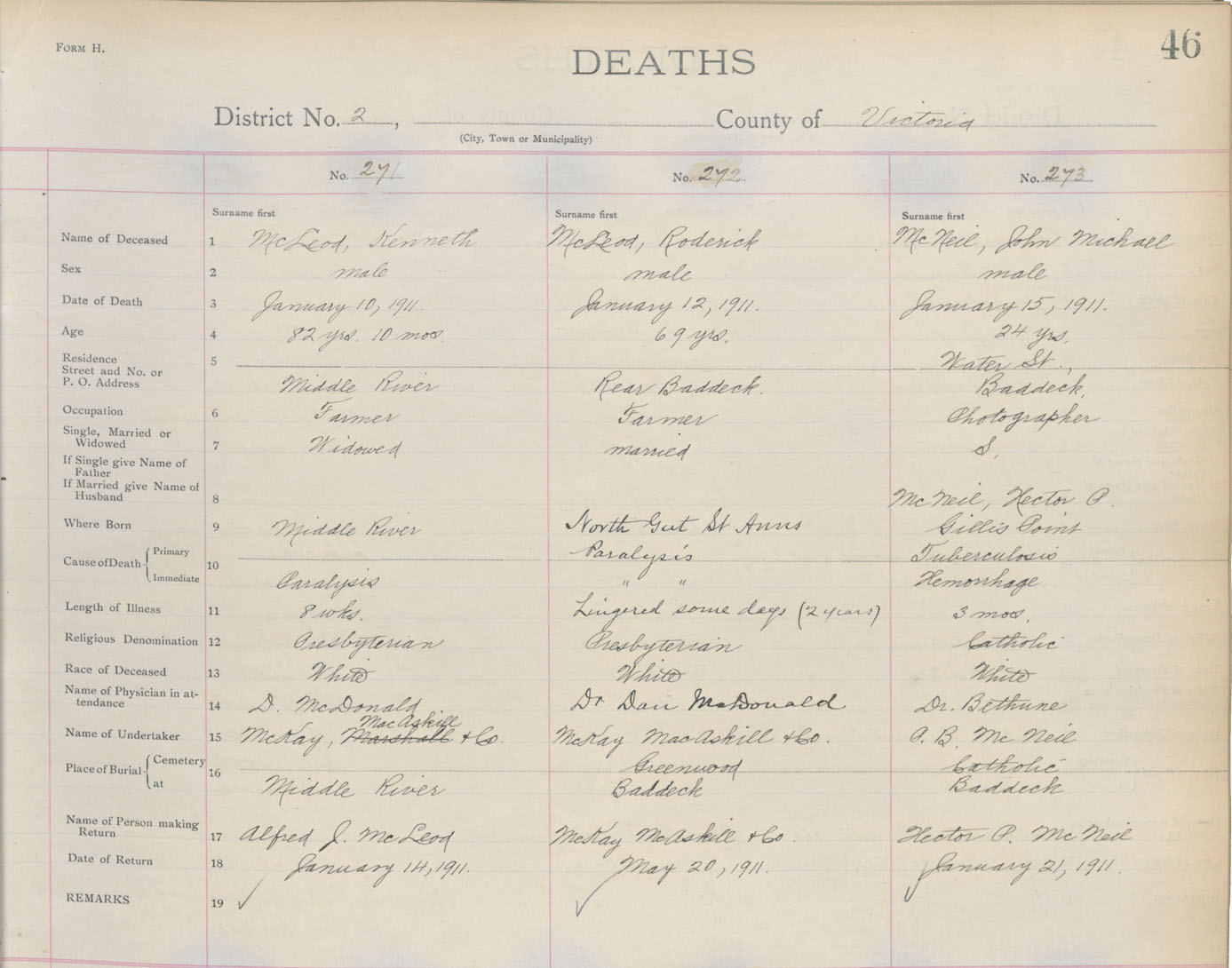Death Registration: Year: 1911 book: 18 page: 46 number: 271
