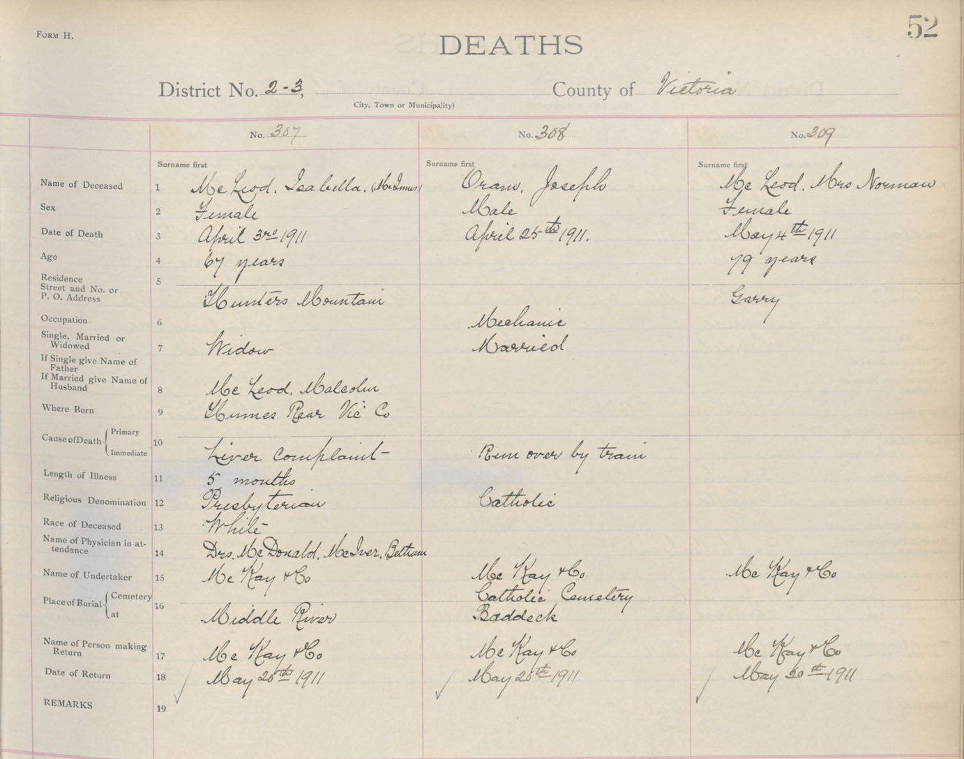 Death Registration: Year: 1911 book: 18 page: 52 number: 307