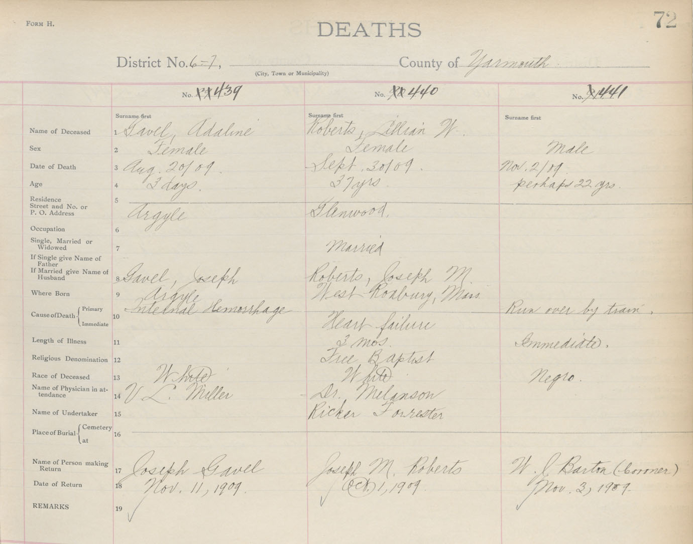 Male Death Registration: Year: 1909 book: 19 page: 72 number: 441