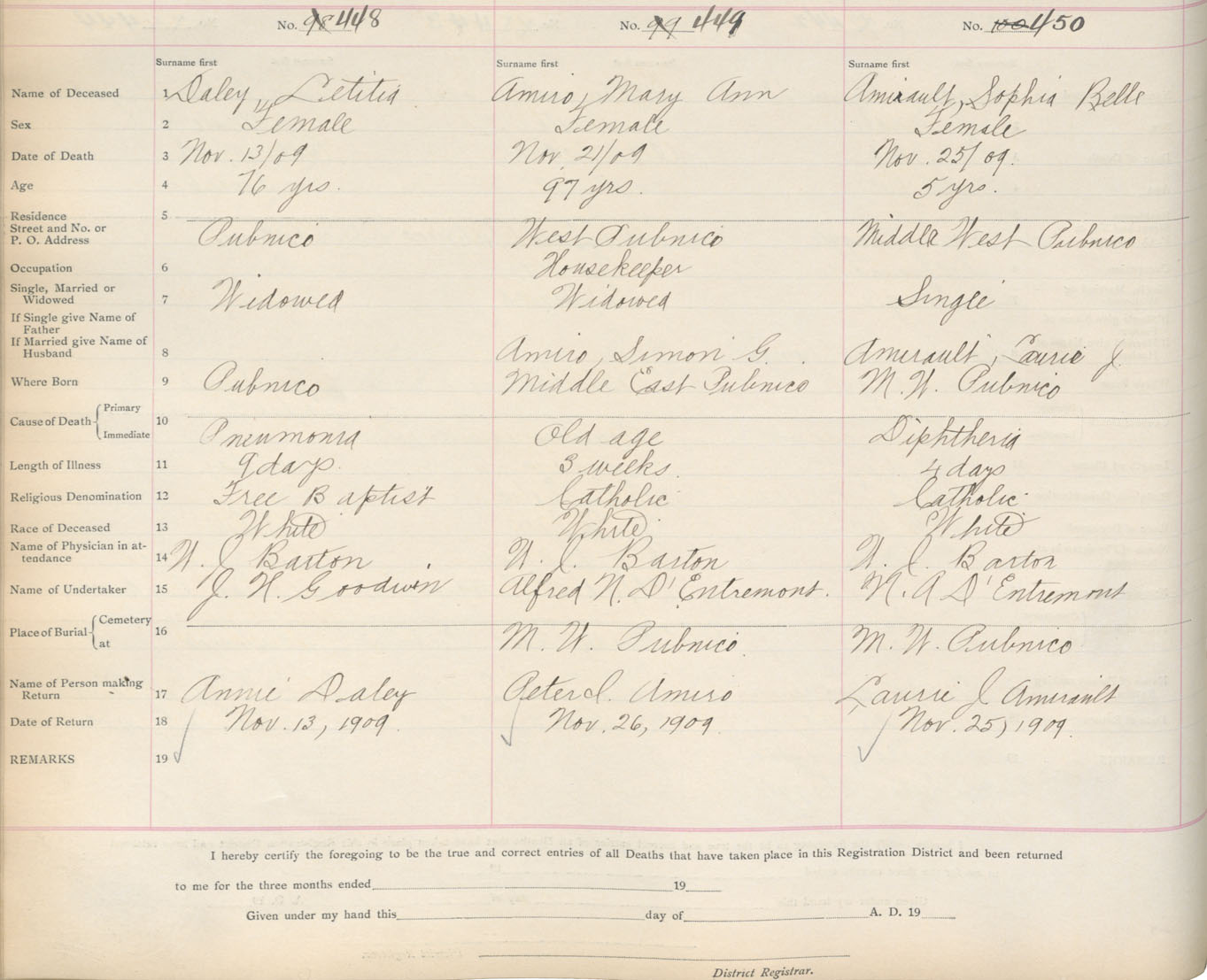 Death Registration: Year: 1909 book: 19 page: 73 number: 450