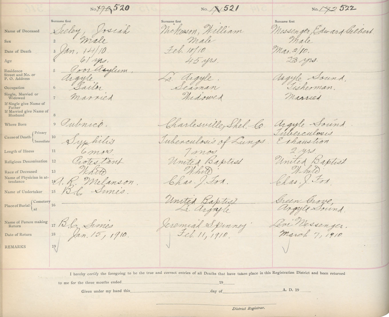 Death Registration: Year: 1910 book: 19 page: 85 number: 522