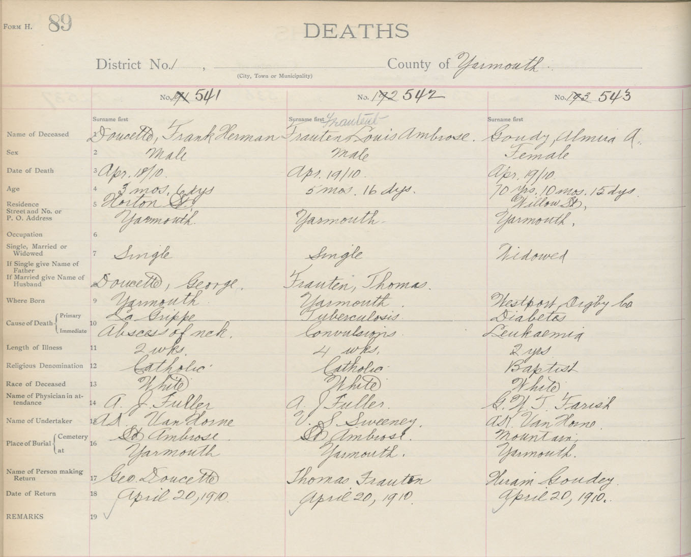 Death Registration: Year: 1910 book: 19 page: 89 number: 543