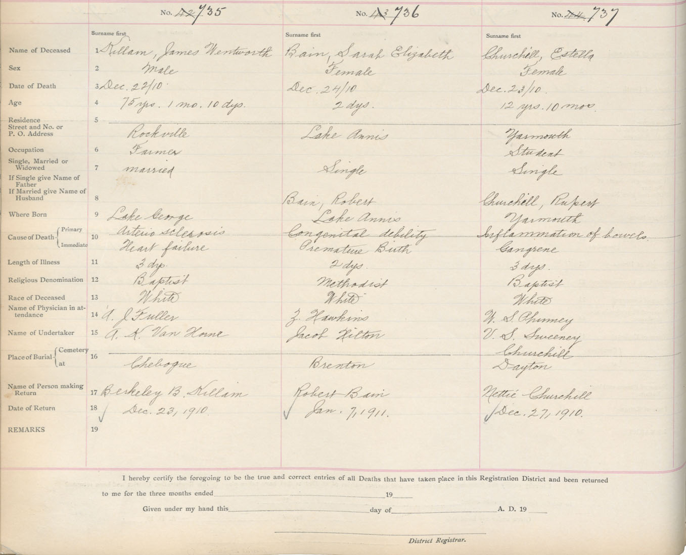 Death Registration: Year: 1910 book: 19 page: 121 number: 735