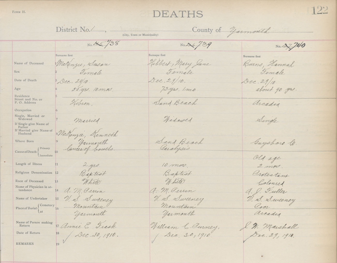 Death Registration: Year: 1910 book: 19 page: 122 number: 738