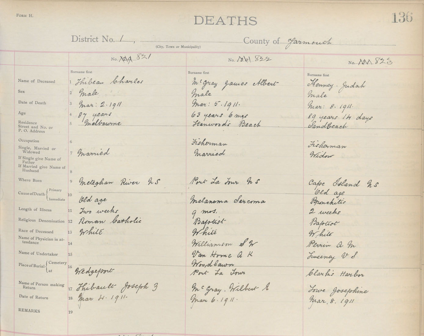 Death Registration: Year: 1911 book: 19 page: 136 number: 821