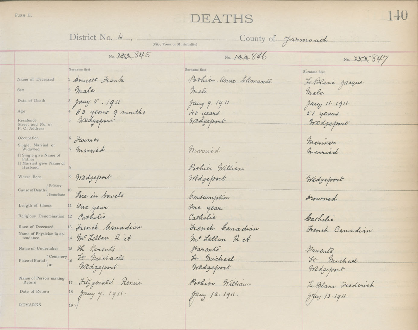 Death Registration: Year: 1911 book: 19 page: 140 number: 845