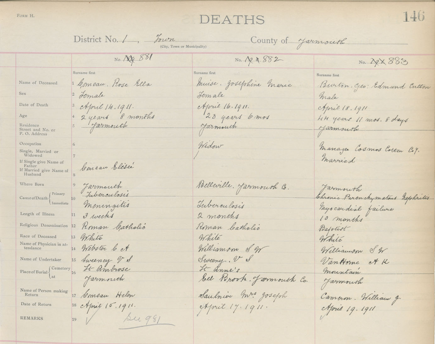 Death Registration: Year: 1911 book: 19 page: 146 number: 881