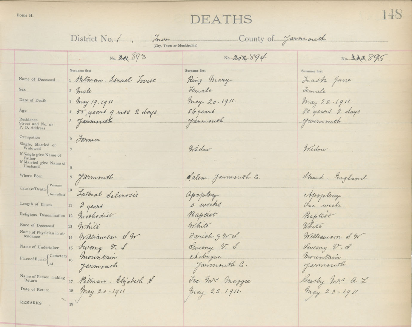 Death Registration: Year: 1911 book: 19 page: 148 number: 893