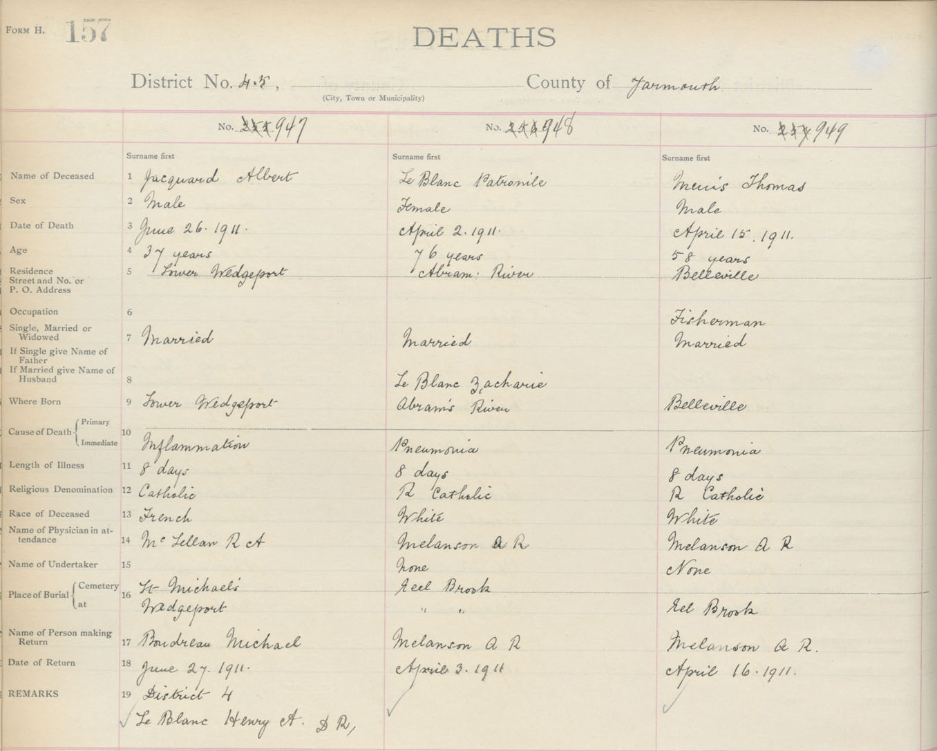 Death Registration: Year: 1911 book: 19 page: 157 number: 947