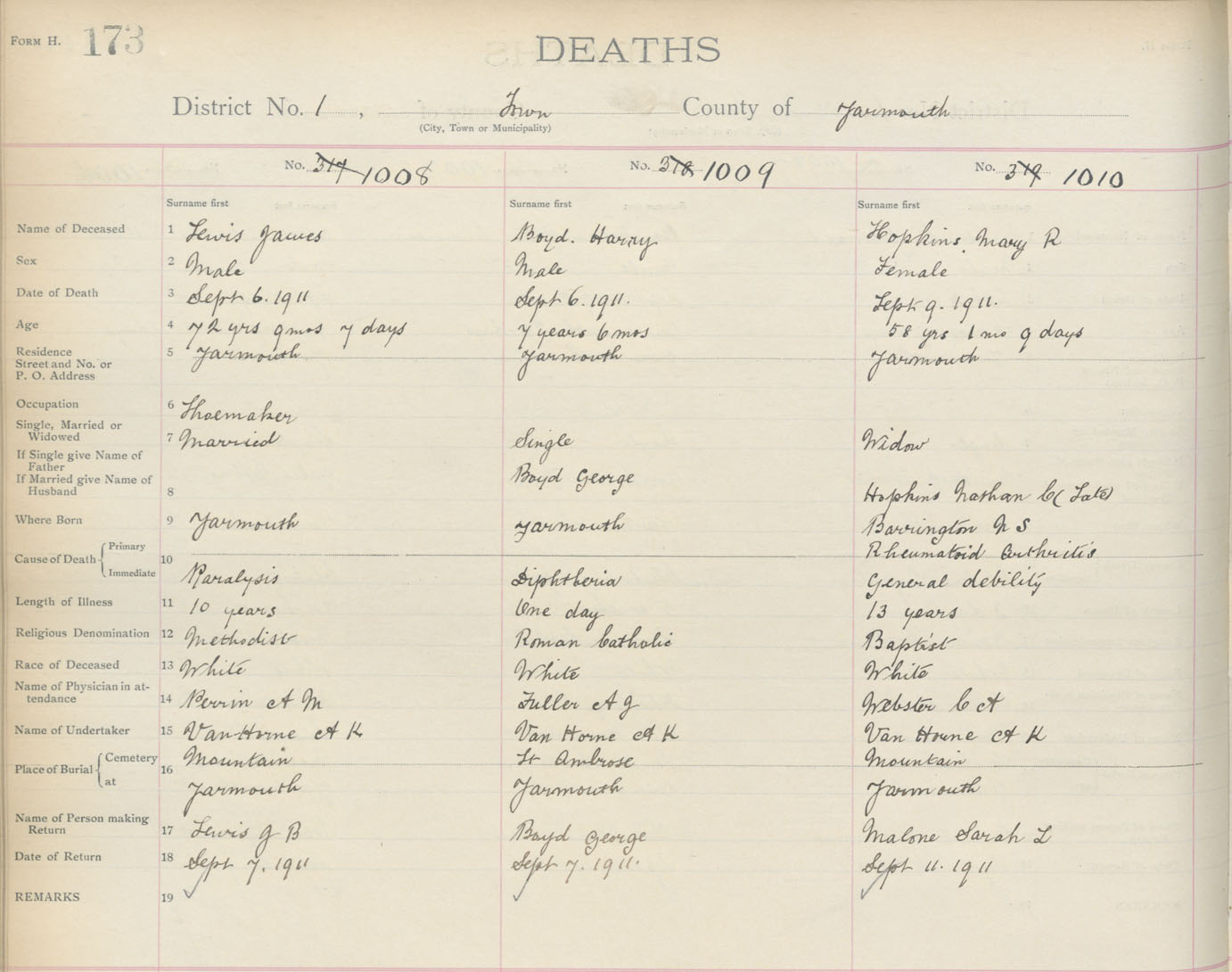 Death Registration: Year: 1911 book: 19 page: 173 number: 1010