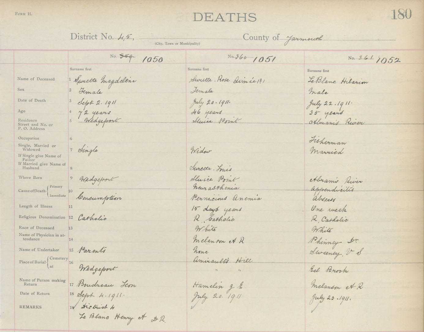 Death Registration: Year: 1911 book: 19 page: 180 number: 1052