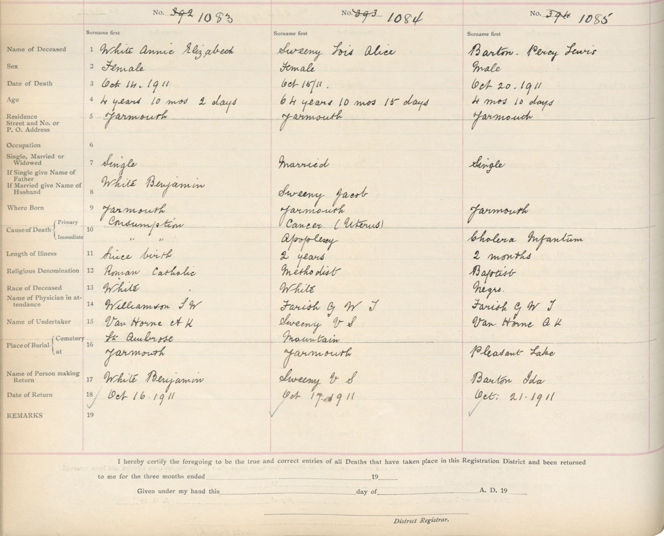 Death Registration: Year: 1911 book: 19 page: 185 number: 1085