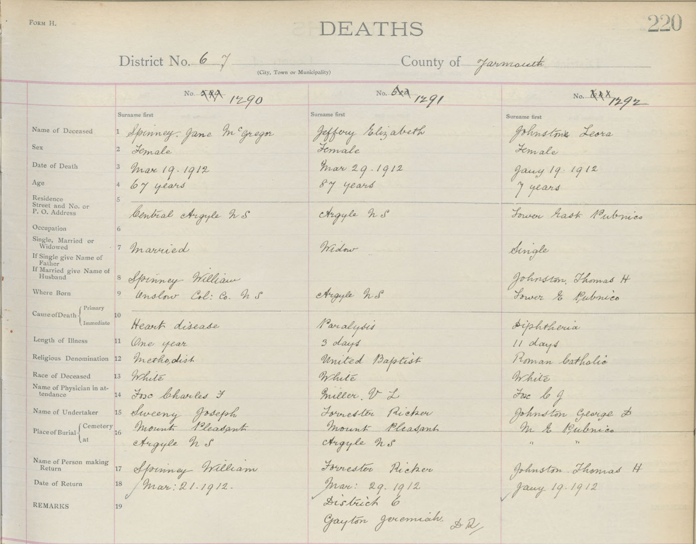 Female Death Registration: Year: 1912 book: 19 page: 220 number: 1290